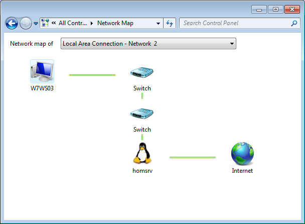 Do you need this? No, but it’s nice to have and it may help to discover network problems. Without this daemon, Windows tries to draw a picture too but it lacks some details. On the left is a picture taken from the actual test network. The Windows machine is connected to our home server via 2 switches.